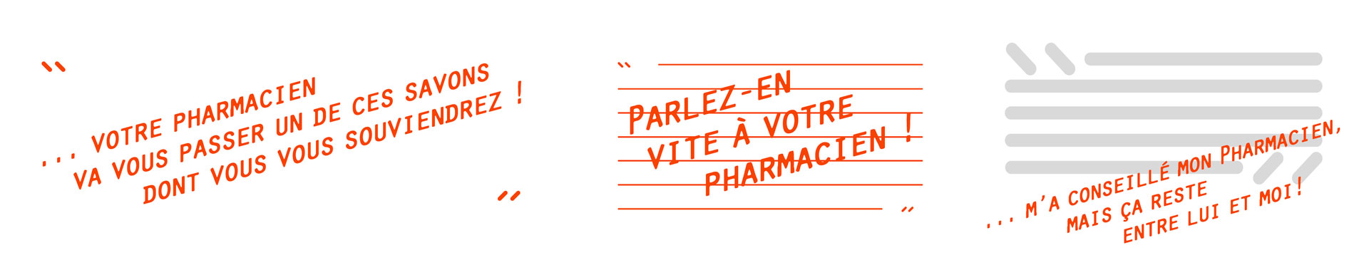 2 - SIGNS OF PROXIMITY AND COMMITMENT (CONVINCE, COMMIT): a particular tone attests to a strong commitment. The pharmacy is the setting, but it is the pharmacist who animates it. He or she provides advice and support, taking responsibility both professionally and personally: his or her values and convictions (principles) guide his or her action (active). "ACTIVE PRINCIPLES" and "P+" (both for "pharmacy", Pradier (the pharmacist's name) and "active principles"...) are the signatures highlighted. But many other messages can be declined (interests, awareness, advice...). We propose a humorous tone, sometimes bordering on impertinence, a sign of openness, curiosity and questioning, supported by a form that suggests expression and exchange. Quotation marks (which also allude to the capsules...) open and close the messages, they are said or reported as such: someone is talking, delivering a medicine is necessarily accompanied by an exchange. Lines are ready to receive other comments: it is interactive, the approach is ostensibly critical.